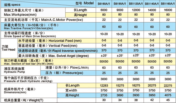 功能与特点: 1.机床的电气化、自动化程度较高。如板料的自动夹紧、刨削过程中的自动进给和自动抬刀及切削行程的自动换向等;可以减轻操作者劳动强度和提高机床的生产效率。 2.机床各主要运动的控制按钮、操作手柄都比较集中,操作方便。主传动箱的导轨采用了镶装式结构,其特点是耐磨和易于检修。床身导轨进行了特殊的表层淬火处理,从而提高了导轨的耐磨性。 3.机床还没有液压夹紧系统,失常切削行程立即停止的联锁、刀架自动进给与快速移动的联锁、床身两端的越程缓冲等各种安全保护装置,以保证操作者和机床运行的安全。